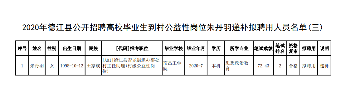 公示名單:《2020年德江縣公開招聘高校畢業(yè)生到村公益性崗位遞補(bǔ)擬聘用人員名單》