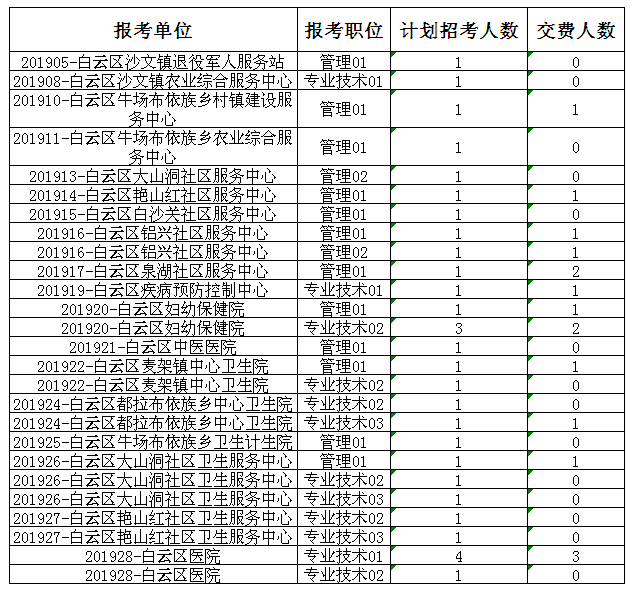 截止2019年8月19日16:00,報(bào)名人數(shù)(以繳費(fèi)人數(shù)為準(zhǔn))與崗位招聘計(jì)劃數(shù)達(dá)不到3:1比例的崗位如下: