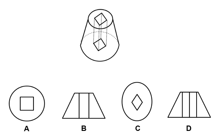 55.左邊的立體圖形是從正圓臺中間垂直向下挖出一個橫截面為正方形的長方體后形成的,將該立方體圖形從任意面剖開,下列哪一項不可能是從垂直于剖面看的視圖( )