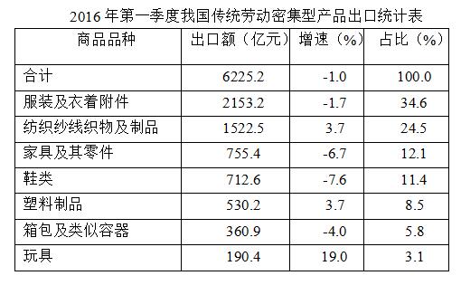 2016年一季度,我國出口紡織紗線織物及制品、服裝及衣著附件、家具及其零件、箱包及類似容器、鞋類、塑料制品、玩具等7大類傳統(tǒng)勞動密集型產(chǎn)品(以下簡稱“傳統(tǒng)勞動密集型產(chǎn)品”)共計6225億元,比去年同期下降1%(同期全國外貿(mào)出口總值降幅為4.2%),占同期我國外貿(mào)出口總值的20.7%。