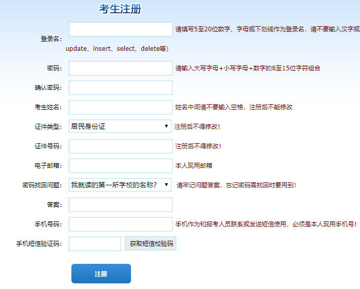 提示:報(bào)名前注冊(cè)的考生可以直接填寫登錄報(bào)名,沒(méi)有注冊(cè)的考生需要先進(jìn)行注冊(cè)在登錄報(bào)名。點(diǎn)擊注冊(cè)按鈕,進(jìn)入注冊(cè)頁(yè)面。