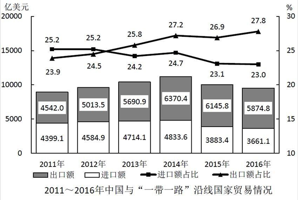 D.2011~2016年中國(guó)對(duì)“一帶一路”沿線國(guó)家出口額占出口總額比重逐年上升