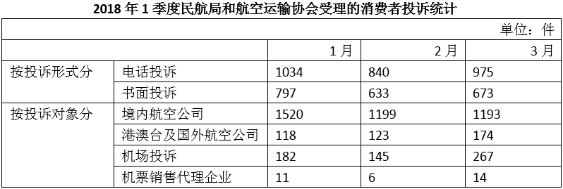 C. 2018年1季度民航局和航空運(yùn)輸協(xié)會(huì)受理境內(nèi)航空公司投訴超過4000件